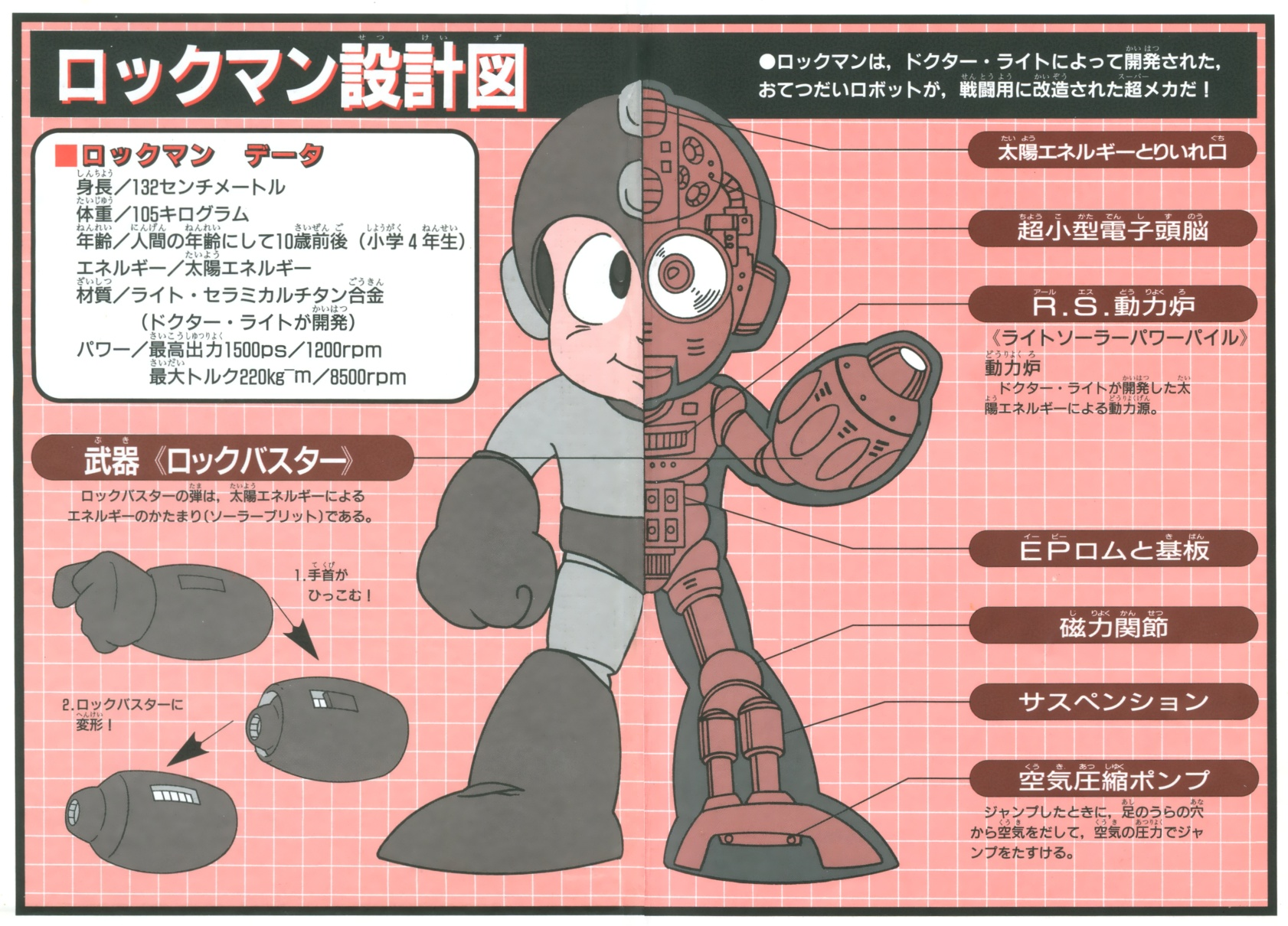 ![]() 洛克人設計圖,動力爐標示於右側上方 | |